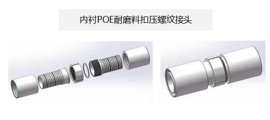 内衬POE耐磨料扣压螺纹接头,是在金属扣压接头的基础上,在芯管内部又增加了内衬耐磨层,以满足耐磨工况需求。 该接头连接方便、可靠性强、耐磨性好。根据腐蚀工况,可选用的材质通常有:碳钢防腐内衬POE、316L内衬POE、双相不锈钢内衬POE。